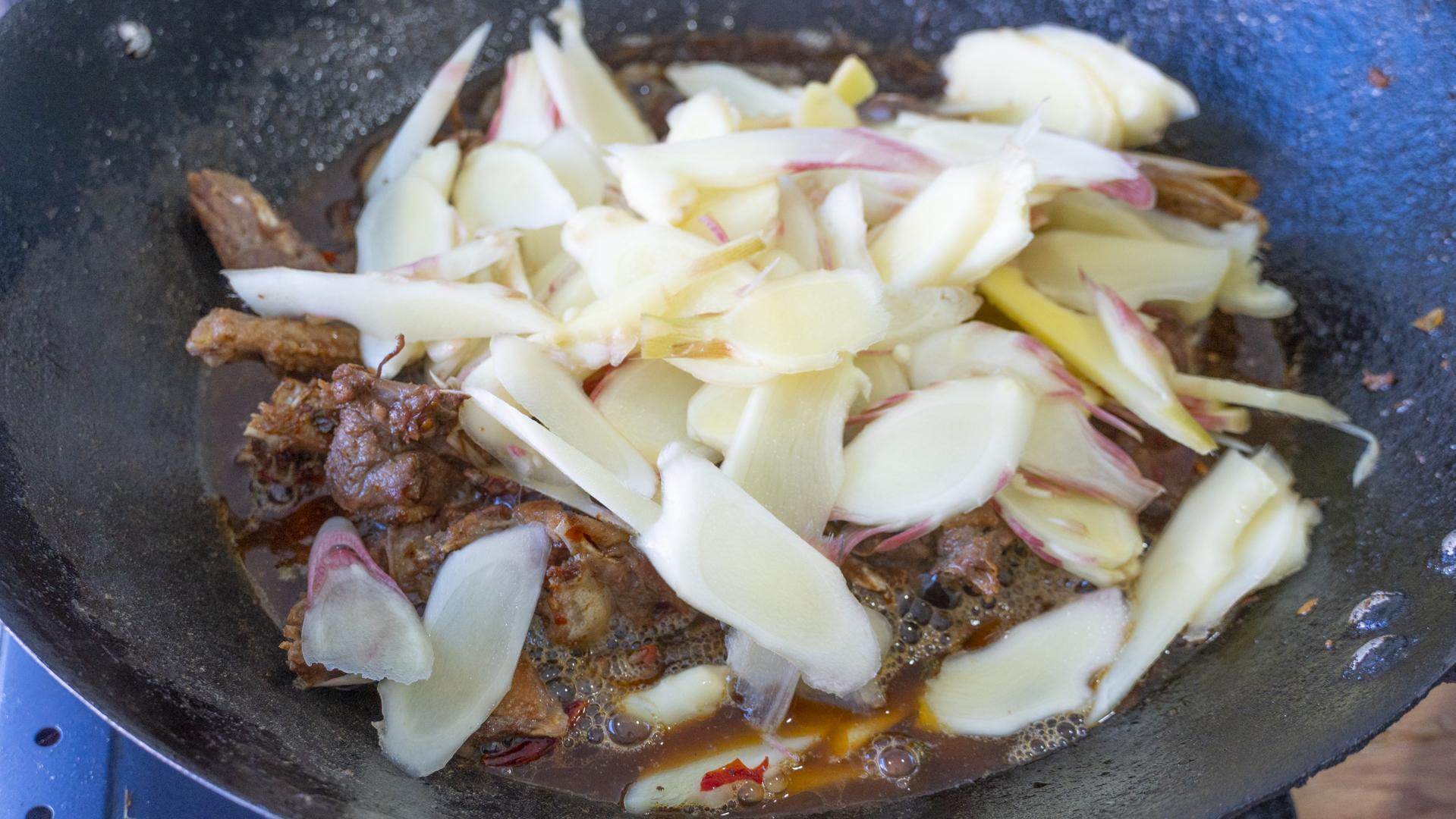 6、出香味兒後倒入切好的仔姜,一罐啤酒,,蓋上蓋子大火煮30分鐘。具體的時間還是要自己掌控的,火力大小不同,而且土鴨子煮的時間會更久一些。
