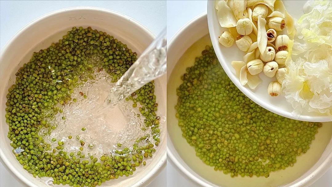 3、綠豆洗淨,與蓮子一同放入鍋中,加入適量清水。