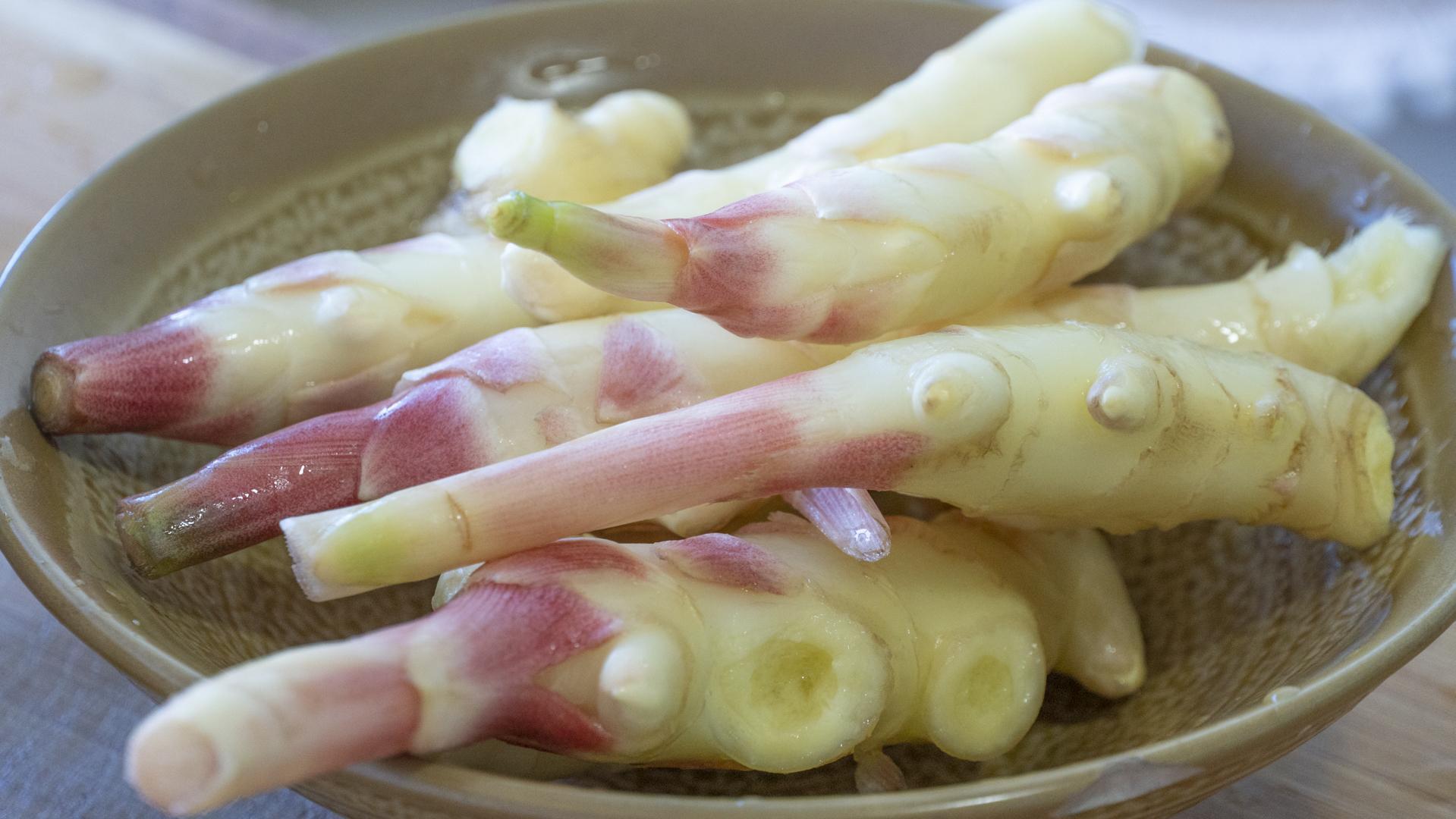 3、仔姜差不多半斤到一斤的量,清洗乾淨,然後切片備用。