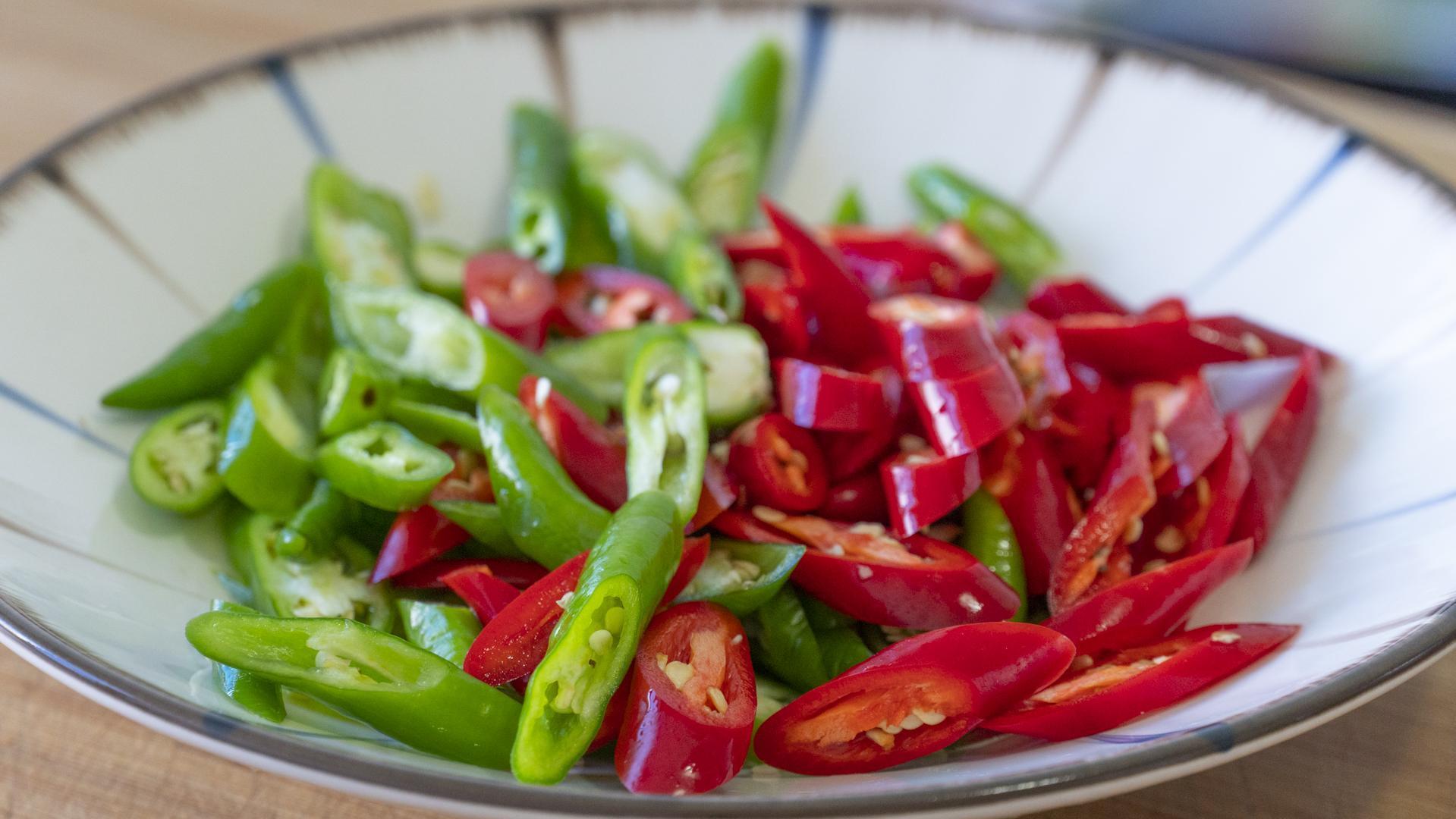 4、青紅線椒各準備一把,洗淨後也切圈備用,喜歡喫辣的還可以加點小米椒。