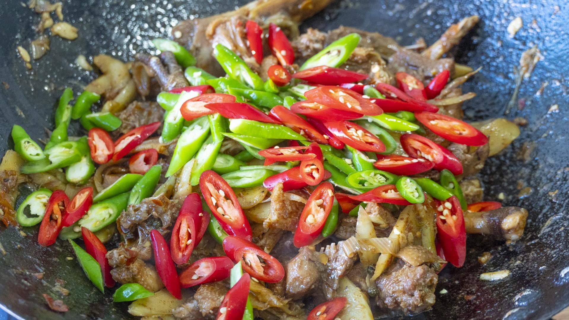 7、鴨肉煮熟了就可以了,開蓋後倒入青紅辣椒。調味兒加生抽、雞精、鹽、糖,翻炒均勻後大火收幹湯汁。