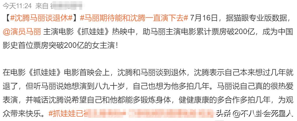 在宣傳《抓娃娃》期間,馬麗和沈騰聊到了退休的話題,沈騰表示自己本來想過幾年就退休了,馬麗則表示自己還想拍到八九十歲呢。