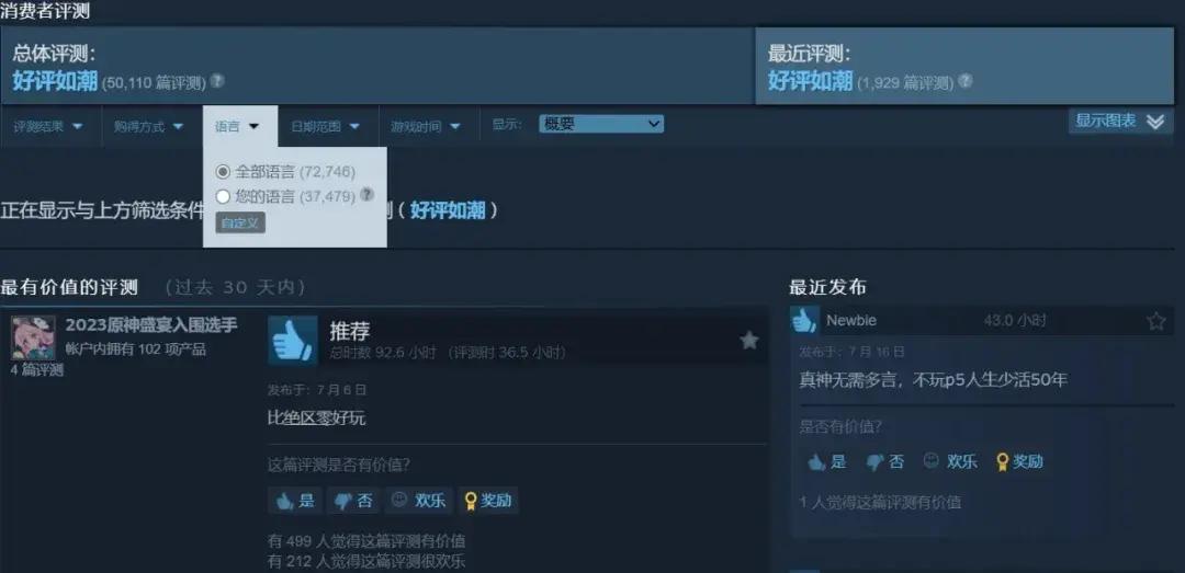 《女神異聞錄5 皇家版》的Steam評論區,中文評價超過半數