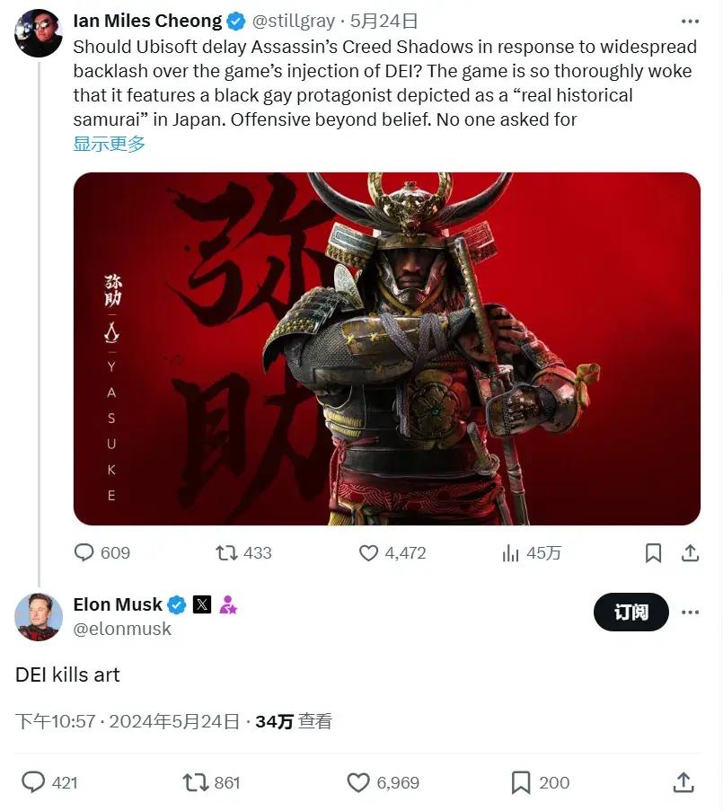 在五月份《刺客信條 影》公佈時,馬斯克便在轉發相關資訊時評論稱:“DEI殺死了藝術”。