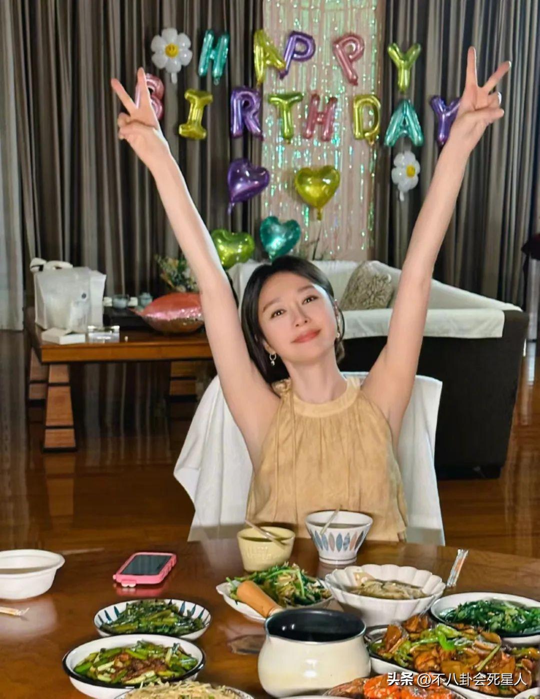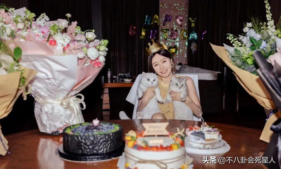 爲了慶祝生日,秦嵐可謂是儀式感滿滿,不僅準備了氣球和鮮花,還準備了一桌豐盛的美食,她頭戴皇冠抱着兩隻小貓,在蛋糕前拍照。