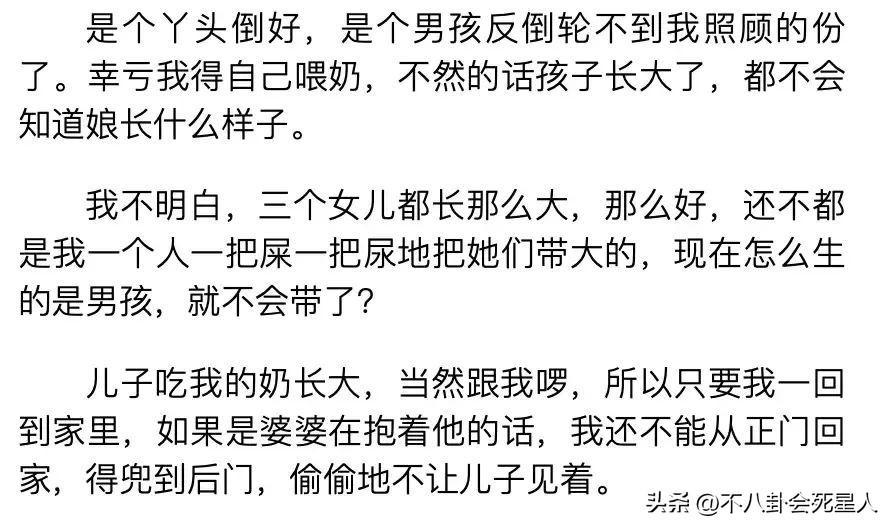 而且3個女兒都是鄭佩佩自己帶大的,但生兒子之後,除了給兒子餵奶,其餘時間都是婆婆搶着帶孩子,甚至鄭佩佩回家的時候,婆婆在家裏帶孩子,她還得繞後門進去,避免被孩子看到。