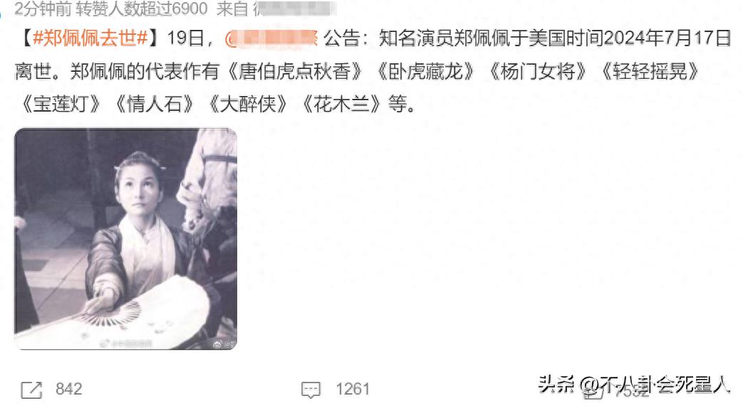 娛樂圈傳來了一個令人悲痛的消息,“武俠影后”鄭佩佩於7月17日在美國去世,享年78歲,代表作有《唐伯虎點秋香》《臥虎藏龍》《楊門女將》《輕輕搖晃》《寶蓮燈》《情人石》《大醉俠》《花木蘭》等。