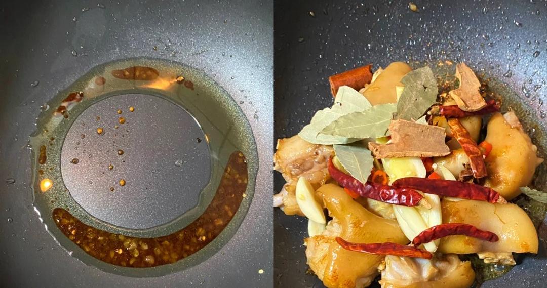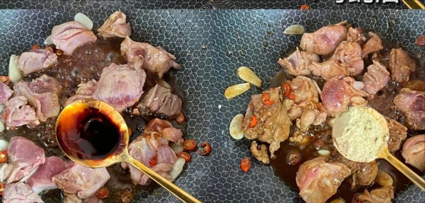 3、熱油炒香姜蒜,倒入雞肉炒至表面微黃。
