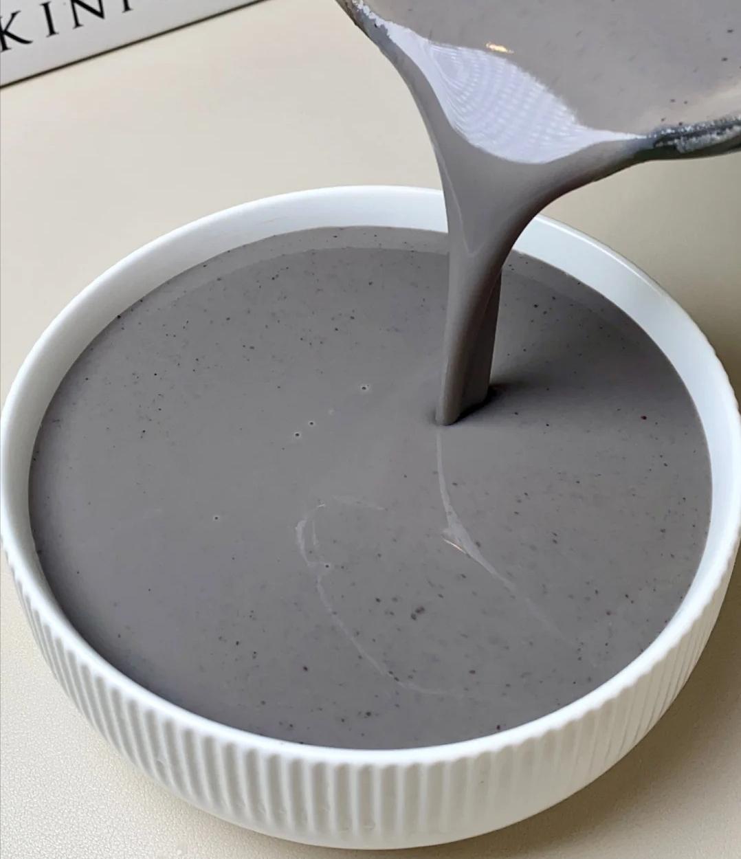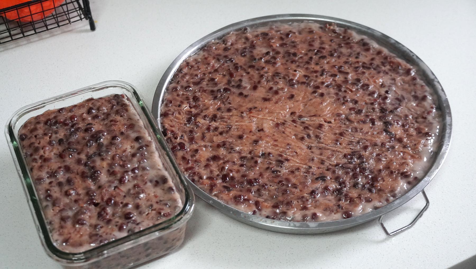 3、赤小豆蒸熟後就加牛奶600克拌勻,再加500克糯米粉,繼續翻拌,接着模具刷油,倒入進去就行。