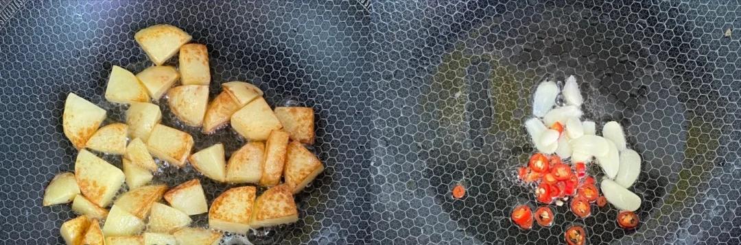 1、土豆去皮切小塊,熱鍋下油放入土豆煎至兩面金黃盛出備用。