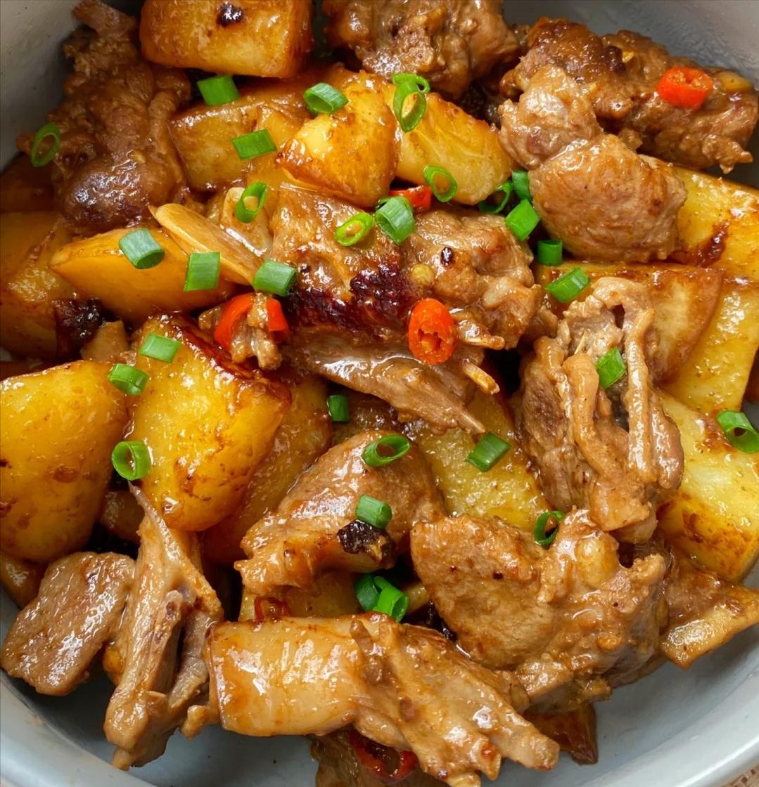4、然後倒入土豆,加入適量清水中小火燜煮30分鐘,出鍋撒點蔥花就可以了。