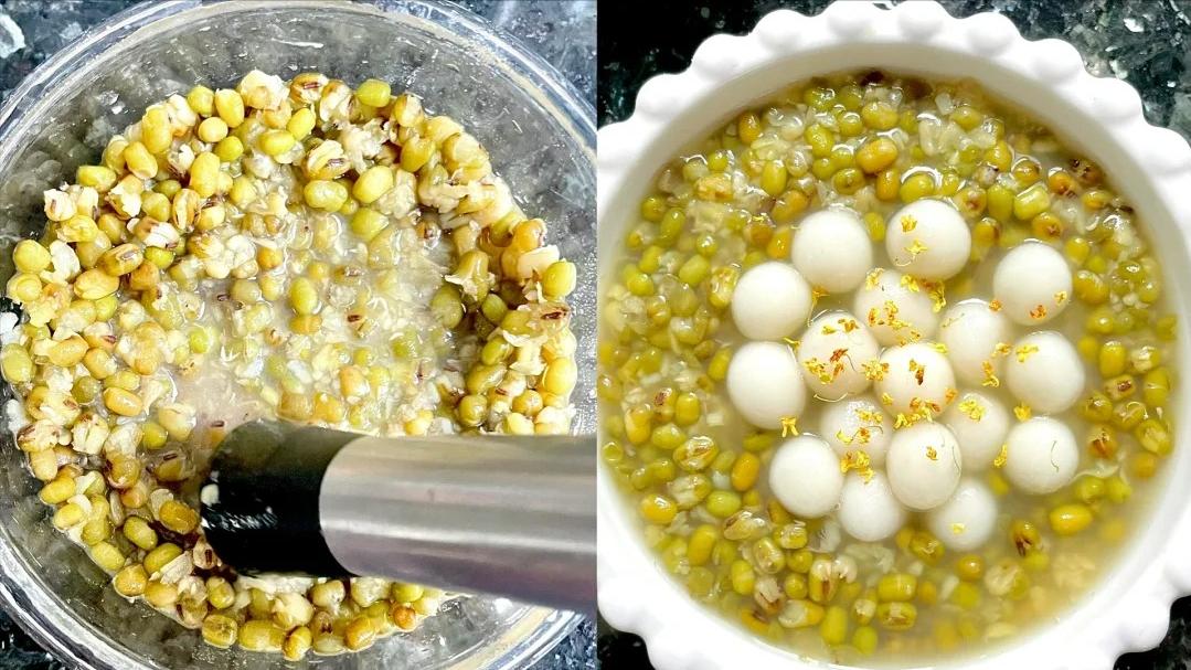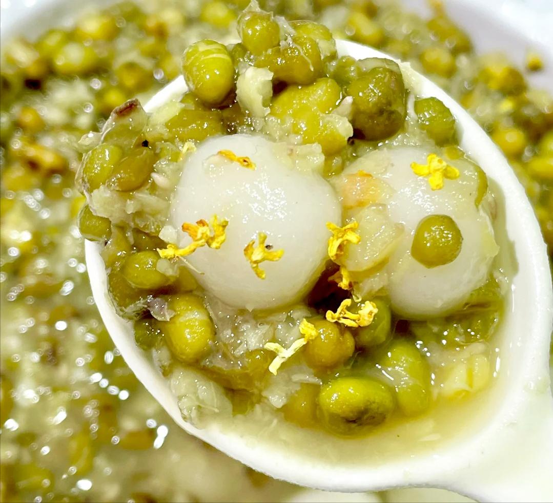 5、喫的時候直接把小湯圓舀入綠豆湯裏面,喜歡喫甜的還可以淋點蜂蜜,或者撒點幹桂花也可以。