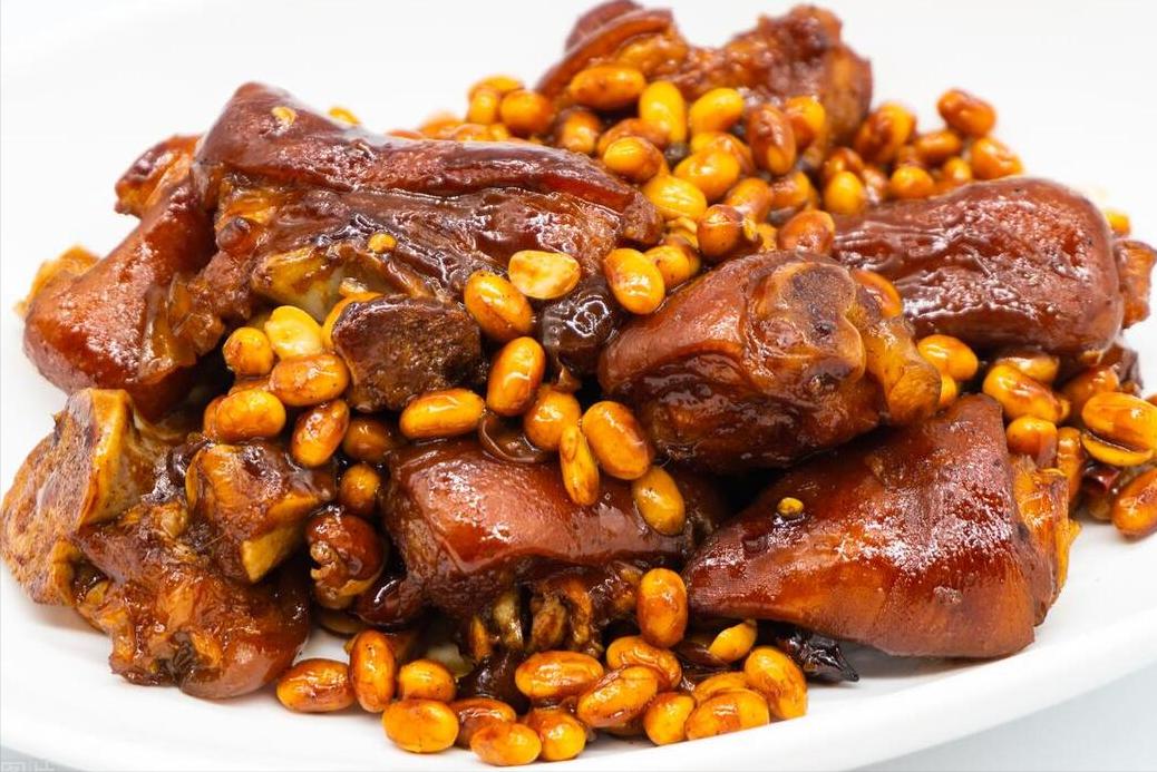 4、小火慢燉一小時放入泡發好的黃豆繼續燜煮半小時,豬到軟爛收汁撒上小蔥花開喫。
