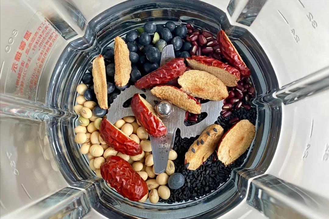 3、破壁機加水,接着把所有的食材都倒進來,再加一小把冰糖,用熱豆漿模式30分鐘。