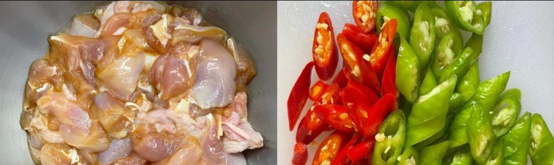 1、雞腿去骨切小塊,加少許鹽、1勺料酒、1勺生抽、1勺澱粉,抓勻醃30分鐘。