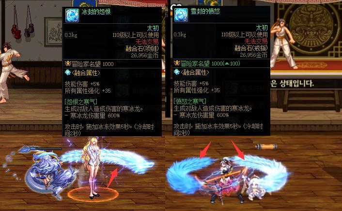 項鍊部位“冰封的怨恨”,戒指部位“雪封的憤怒”,佩戴該裝備後生成對敵人造成傷害的“冰龍”。
