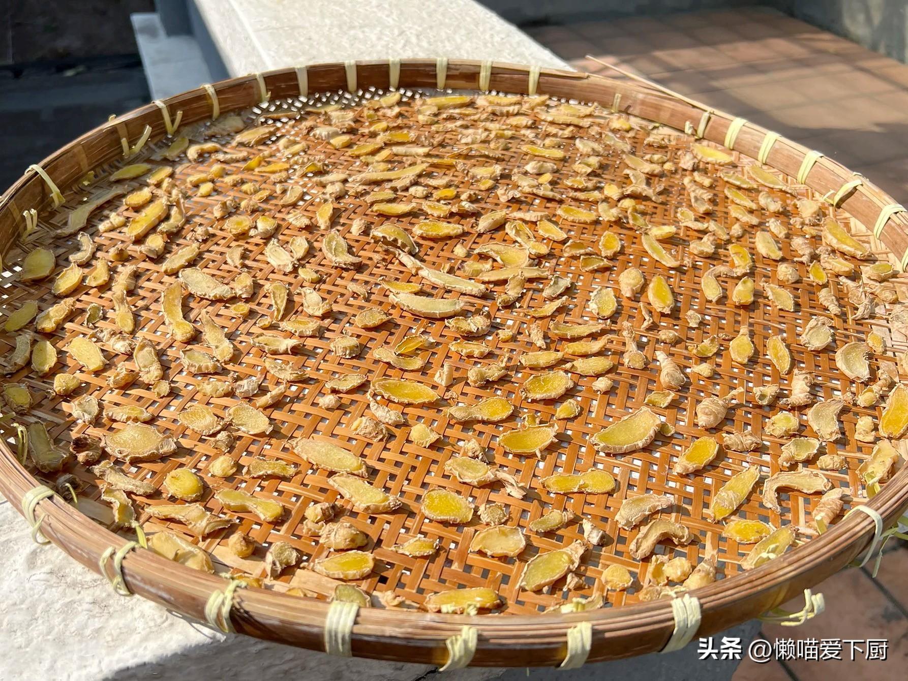 ③曬姜:記得提前看下天氣預報,選連續幾天都是大晴天的日子,將生薑平鋪在簸箕上,放在太陽底下曬2-3天,白天在外面曬,晚上收進屋內,要完全曬乾、曬透。