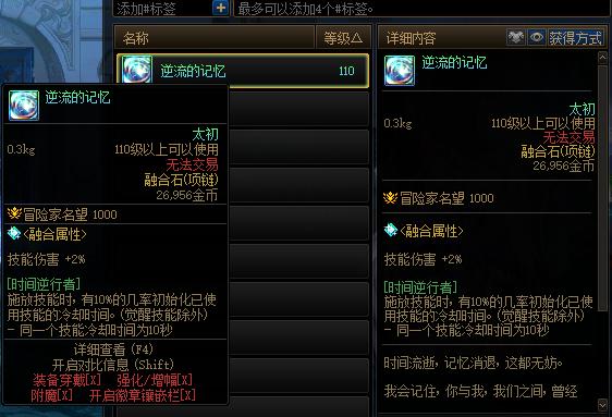 「1」逆流的記憶:技能傷害+2%,釋放技能時有10%概率初始化技能冷卻,運氣好的話,可以連續觸發多個技能,相當於低配版的青蛙。
