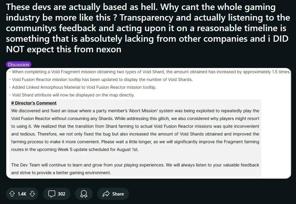 還有像是玩家們利用“放棄任務”的機制,以求在短時間內多次進行“虛空任務”,來刷取虛空碎片素材。開發團隊很快修復了這一“良性”bug,但也承認這是虛空任務的機制過於不便才迫使玩家們出此下策,修復只是因爲這樣的做法不符合邏輯,但在修復之外,他們對任務模式和獎勵也進行了優化,讓玩家不再需要這個Bug也能刷到同等足量的素材。