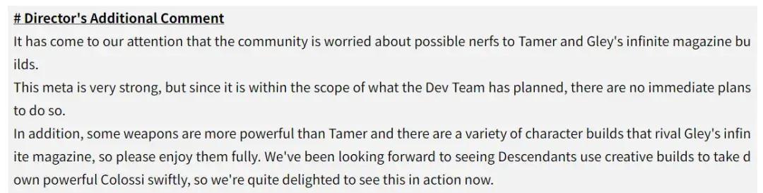 比如此前玩家們曾擔心在遊戲中表現相當強勢的“無限榴彈/機槍格雷”流派會遭到削弱——這種做法在同類遊戲中司空見慣,但《第一後裔》的開發者不僅出面表示格雷的“無限子彈”的玩法完全在團隊的預料中,大家可以放心玩,還說希望玩家們能盡情享受遊戲併發掘“更多強力的玩法”。