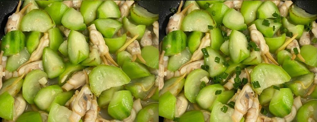 4、鍋中再放少許油,放蔥花爆香,放絲瓜翻炒。