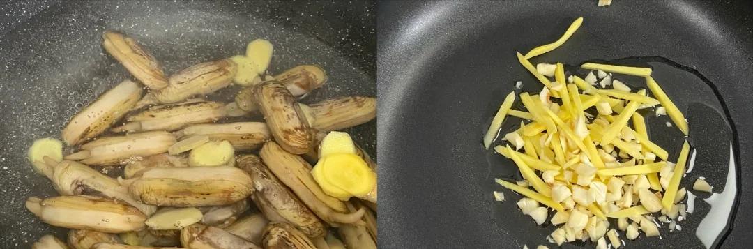 1、水開放蟶子、薑片焯水至開殼撈出,去殼去黑線備用。