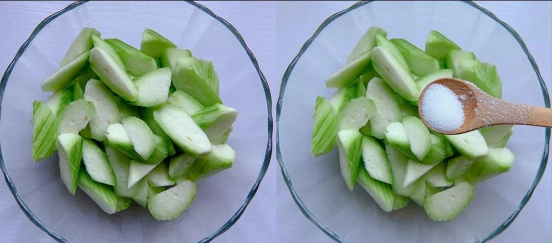 1、絲瓜去皮切滾刀塊,放一勺鹽拌勻,絲瓜不會氧化變黑,煮之前沖洗一下。
