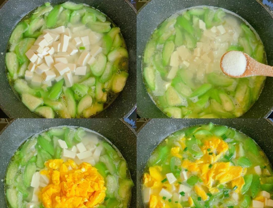 5、放適量清水,大火燒開,將絲瓜煮軟加豆腐、鹽、雞蛋、胡椒粉、香蔥即可。