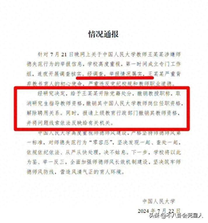 7月22日晚,中國人民大學發佈情況通報,經過調查,舉報情況屬實,王貴元嚴重違反校規和教師職業道德。經研究決定,給予王貴元開除黨籍處分、撤銷教授職稱、取消研究生指導教師資格,撤銷其中國人民大學教師崗位任職資格,解除聘用關係。