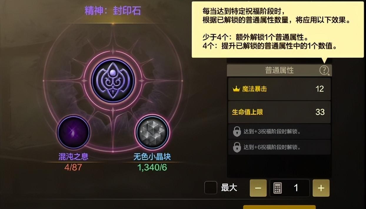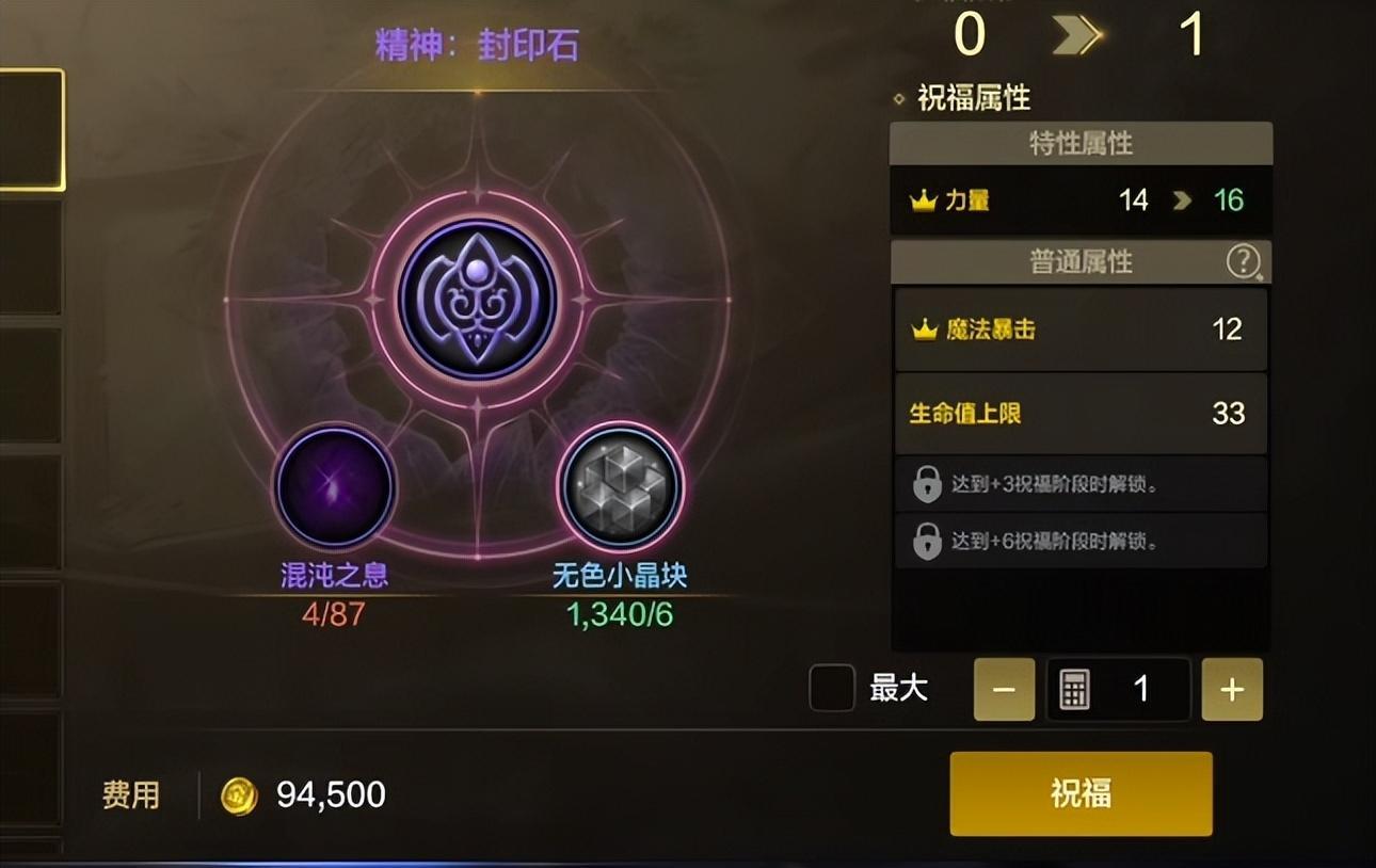 消耗「混沌之息+無色小晶塊+金幣」,可以祝福封印石和精髓,從而提升更多的屬性。
