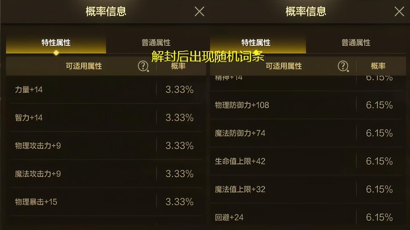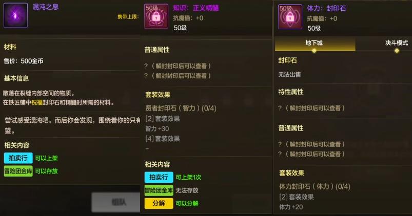爆出封印石和精髓後,需要先解封、然後才能看到具體屬性,包括了各種力量、智力、攻擊、暴擊、體力等詞條。