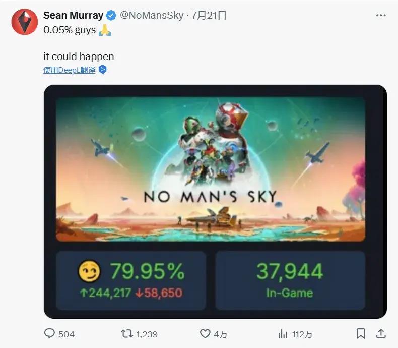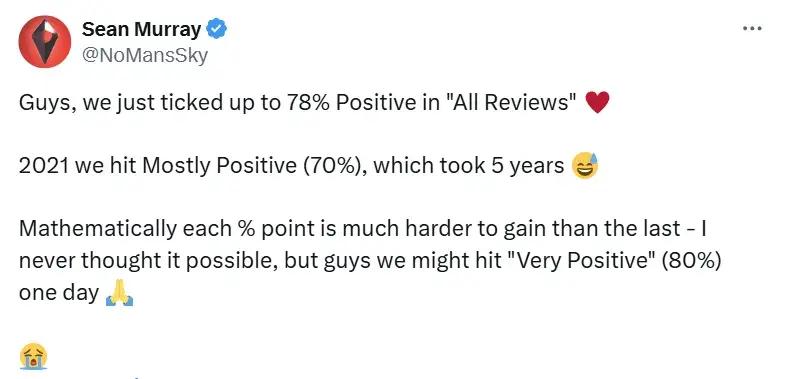 今年4月的時候,《無人深空》的好評率爲78%,遊戲開發者Sean Murray在推特上傾訴,光是讓遊戲好評率回到70% 就花了他們5年的時間,他們很希望遊戲能夠達成“特別好評”的評價,但以數學的角度來看,百分比的增長只會越來越難。