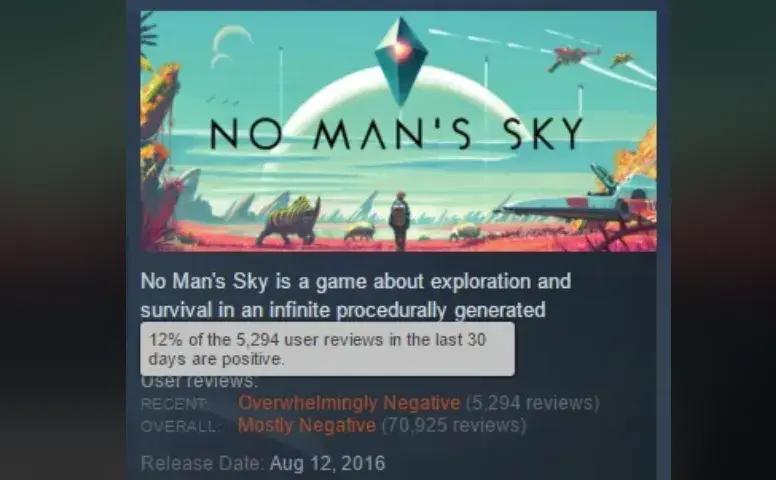 重複的流程,敷衍的玩法,毫無驚喜感可言的遊戲體驗,《無人深空》在首發階段實現了前所未有的口碑崩盤,短短兩週內遊戲在線人數暴跌90%,當時遊戲的差評率已經刷新了Steam記錄,甚至還能隔空跟《三國殺》掰掰手腕。
