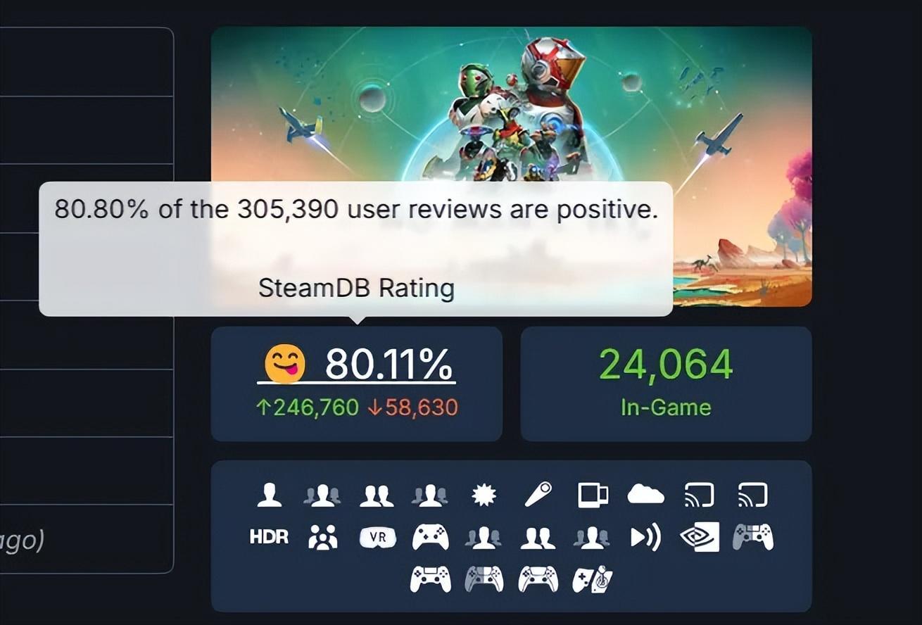 2018年“褒貶不一”、2021年“多半好評”,到了2024年7月,《無人深空》的Steam好評率超過80%,正式步入“特別好評”的區間,此時距離遊戲發售已經過去了8年的時間。