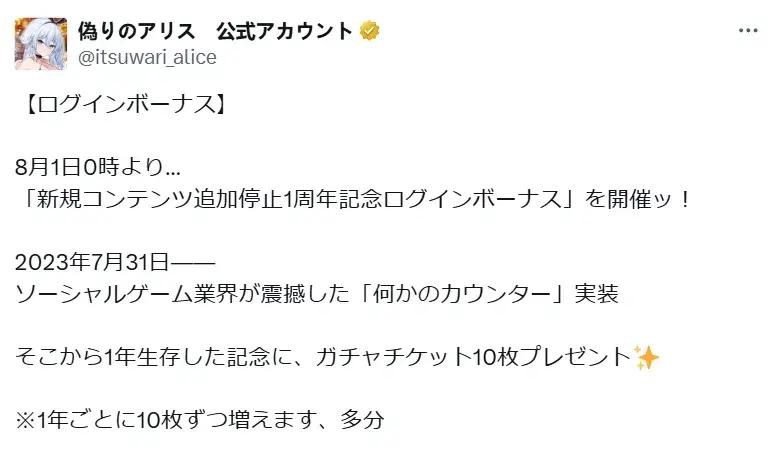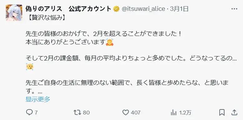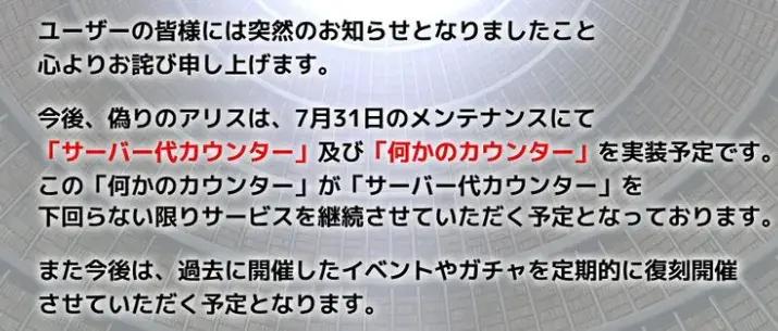 爲了不讓遊戲徹底停服,一批又一批的新玩家開始了《虛僞愛麗絲》的旅途。大家的消費熱情並沒有隨着時間的推移而流逝,每個月近200萬日元的服務器運營費用通常都會在10號左右順利達成,如果玩家們氪金太過積極,官方甚至還會發文勸大家量力而行。