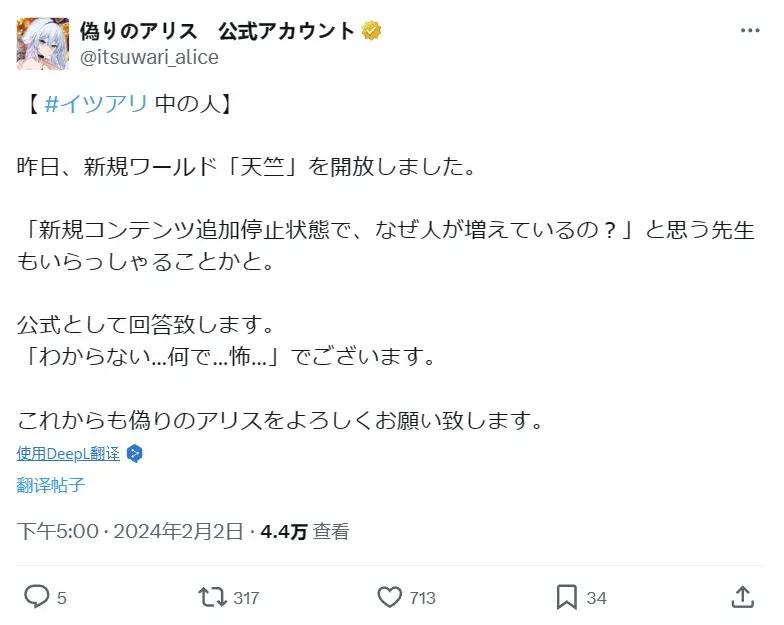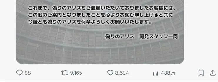 《虛僞愛麗絲》的停服通知在推特上收穫了近1萬次轉發和近500萬次的查看,非常遺憾的是,這很有可能是《虛僞愛麗絲》官推自建號以來發布的最火的一條推文。