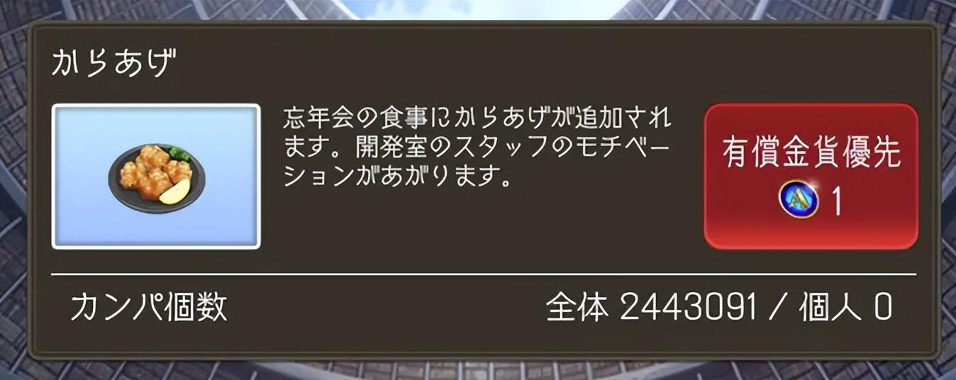 伴隨着此次停服更新,遊戲內不僅實裝了服務器費用計數器,還實裝了個新的“募捐商城”,玩家可以花錢購買一些沒有實際作用的道具,就比如這個炸雞,描述裏寫的是“忘年會的菜單裏追加一份炸雞,能讓開發組的員工提升動力”。