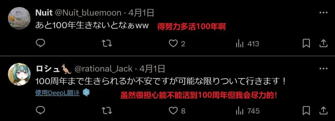 也許是發現了玩家們的氪金速度不降反增,今年4月,《虛僞愛麗絲》開啓了“距離100週年還有95.5年”的獎勵活動,從玩家們的評論來看,比起“《虛僞愛麗絲》到底能不能活到100週年”,大家反倒更在意自己能不能活到那個時候。