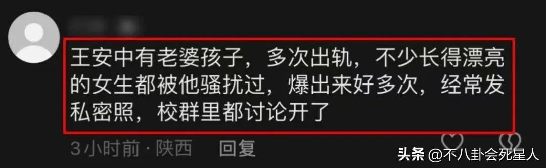 有網友稱王安中在學校風評不太好,他有老婆孩子,不僅騷擾學生,還多次出軌。