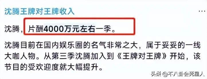 另外,除了拍電影,沈騰還是圈內熱門綜藝的常客,比如《王牌對王牌》系列,之前有傳沈騰錄製《王牌對王牌》的片酬是4000萬左右。