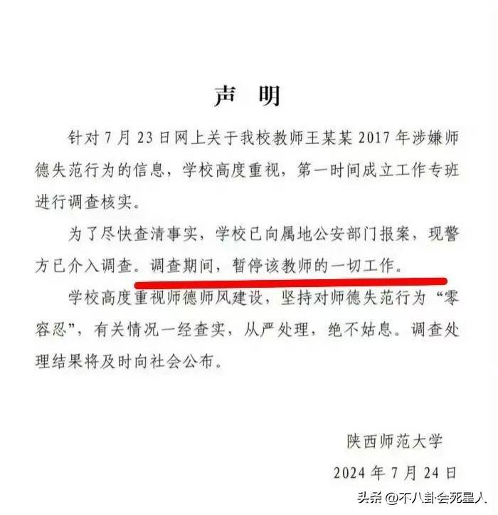 輿論越鬧越大,陝師大校方發佈聲明,表示學校已經報案,公安機關介入調查,王安中已暫停一切工作。聲明中提到的時間是2017年,距離現在都7年了,令人細思極恐。