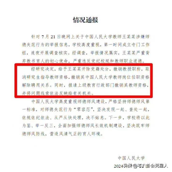 事件曝光後,中國人大第一時間發聲明稱會連夜調查,沒過多久,中國人大再次通報,表示情況屬實,經研究決定,撤銷王貴元教授職稱,取消研究生指導教師資格,撤銷其中國人民大學教師崗位任教資格,解除聘用關係。