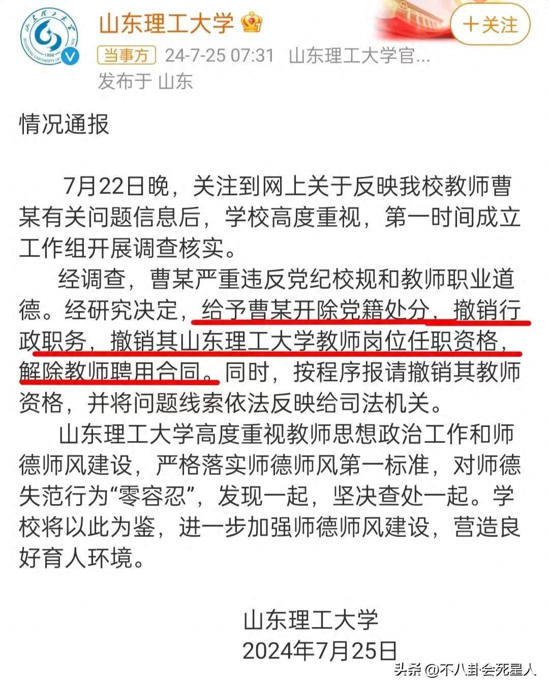 最近一些高校陸續曝出醜聞,僅僅3天時間,就有3個老師現出原形,真是一言難盡。首先來看山東理工大學曹悅的事,7月25日,學校官方發佈通報,稱經過調查情況屬實,經研究決定,撤銷曹悅行政職務,撤銷其教師崗位任職資格,解除教師聘用合同。