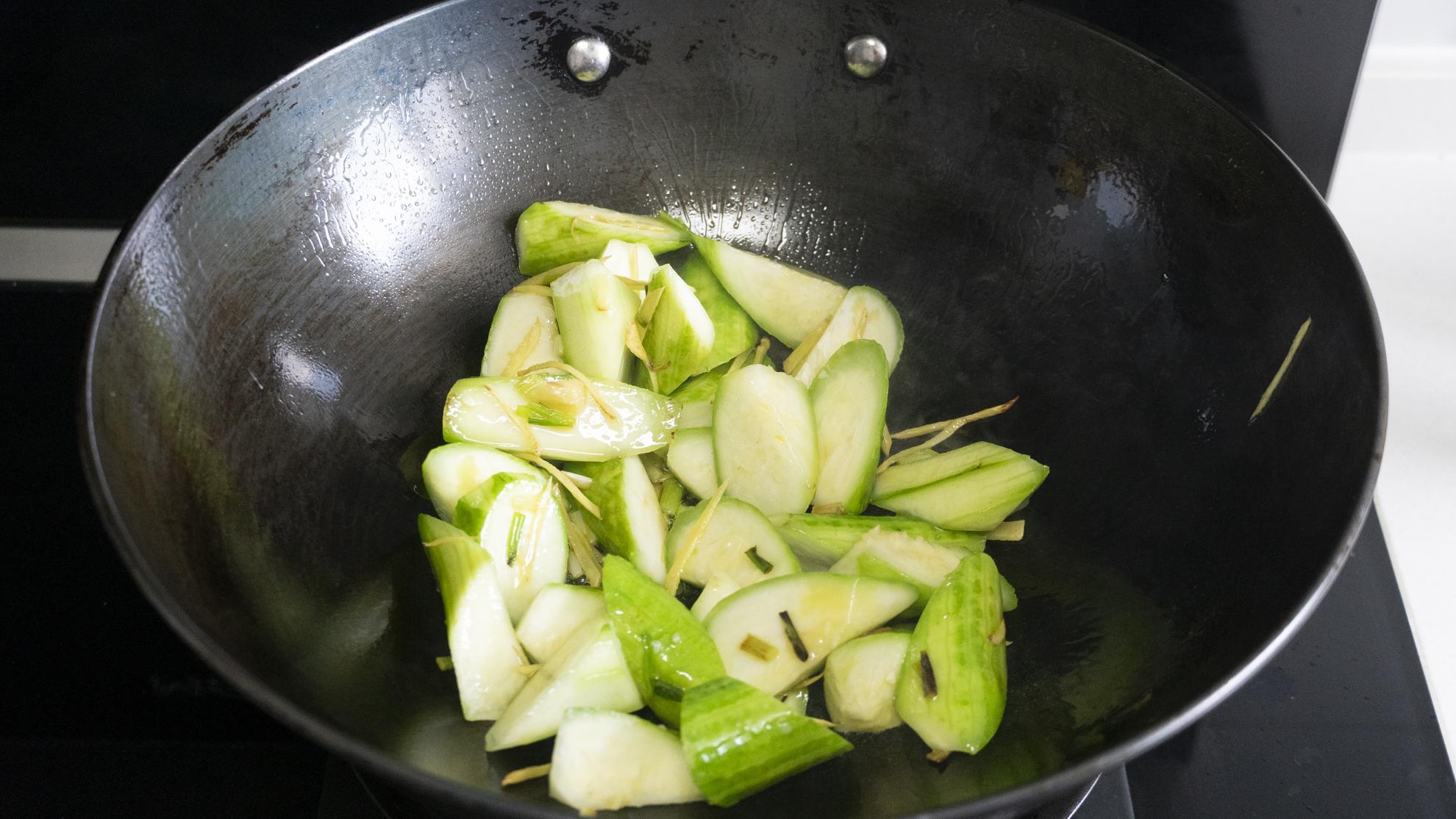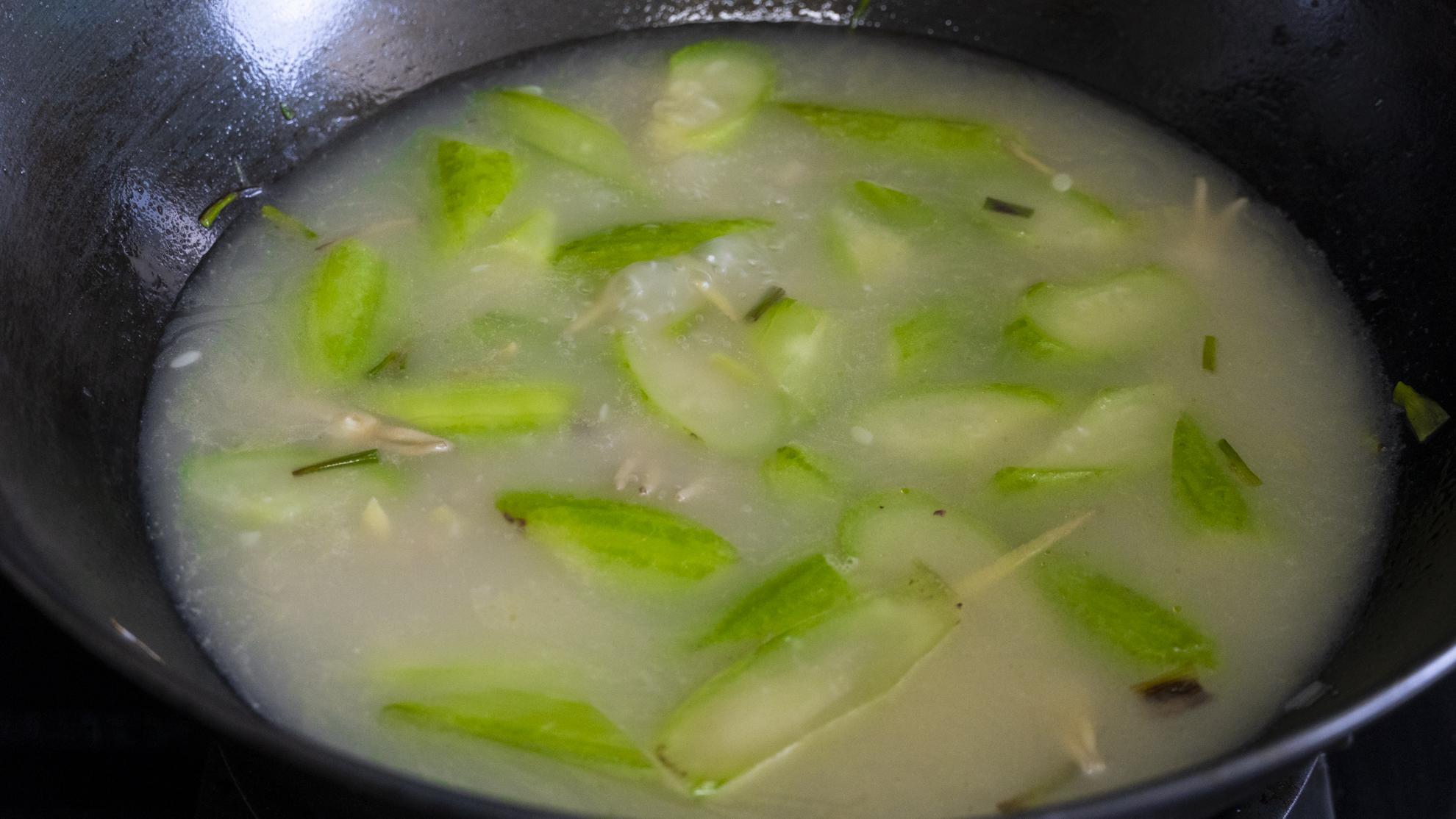 第六步:起鍋熱油,下蔥姜爆香,然後倒入絲瓜炒一炒,先把絲瓜炒軟,這樣喫起來會更香。