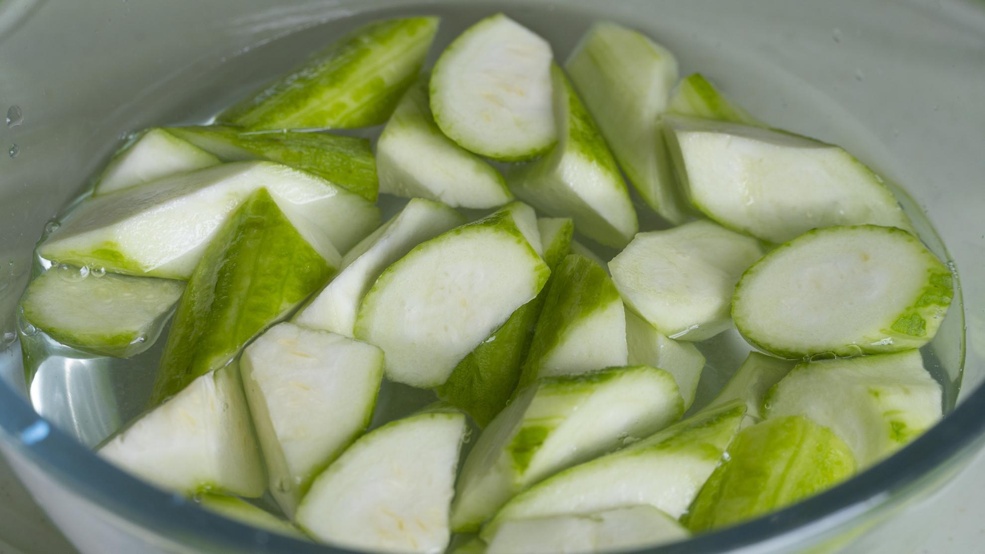 第二步:絲瓜切好後放入大碗裏,加一勺鹽後加水泡着,避免氧化變黑,或者你也可以最後再來切絲瓜。