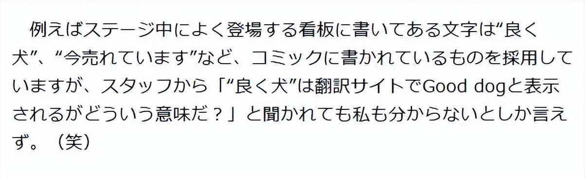 比方說,《忍者殺手 火燒新埼玉》的遊戲開發環節,一位身處海外的開發者表示自己沒搞懂爲什麼遊戲中的廣告招牌要寫上“現在正在賣好狗狗”這樣意義不明的標語。