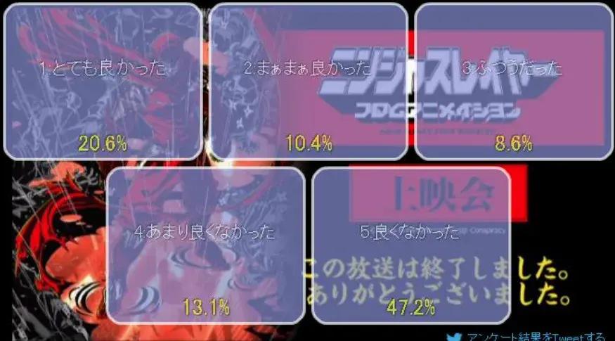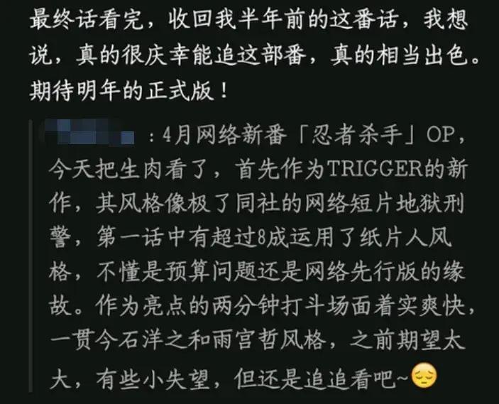 然而,隨着動畫最後一集的完播,Niconico的觀衆好評率回彈至90%,耐着性子一路追完整部番的觀衆大都收回了此前尖酸刻薄的銳評,紛紛爲《忍者殺手》動畫給出好評。