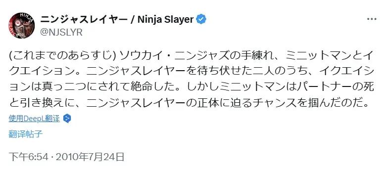 “梗比作品火”的現象對《忍者殺手》來說其實並不稀奇,2010年,幾個日本網友以翻譯組的身份,在推特等網站上展開了《忍者殺手》的連載之旅。按照這些翻譯人員的說法,《忍者殺手》是美國作者撰寫的小說,爲了不破壞原作的氛圍,他們在翻譯時採用了刻板生硬的機翻風味,主打的就是讓人看得一頭霧水,茫然不解。