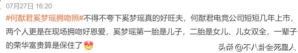 同樣地,何猷君和奚夢瑤結婚短短4年時間,他不但成立了自己的電競公司還上市了,前段時間還當上了武漢政協委員,在內地的創業之路順風順水,難怪網友說奚夢瑤“旺夫”了。