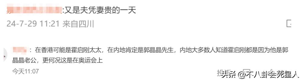 要知道霍啓剛雖然是豪門後代,但在國際知名度上遠不如郭晶晶。比如這次巴黎奧運會上,鏡頭切到臺下的郭晶晶,霍啓剛和霍震霆,字幕介紹是是跳水名將郭晶晶和她的先生們。